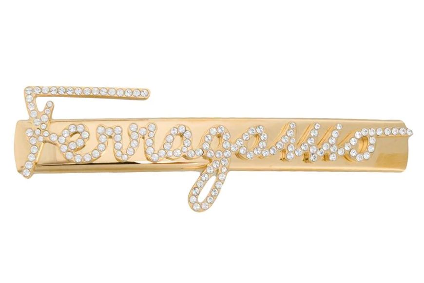这个发夹闪亮的金色饰面上,饰有以施华洛世奇水晶镶嵌而成的手写版Ferragamo标志,风格华丽,十分闪耀。