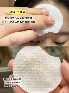 擦拭法(适合新手或建立耐受期) 初次使用或油性、干、混合性的皮肤,建议先用棉片的纹理面,在洁面后的干燥皮肤上轻轻擦拭。重点照顾T区、下巴等易出油、长闭口粉刺的部位。这种方式安全可控,能帮助肌肤平稳适应水杨酸。
