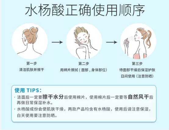 日间使用必须防晒:水杨酸具有促进角质代谢的作用,日间使用后必须严格防晒,以防紫外线导致色素沉着。建议搭配SPF30/PA+++以上的防晒产品。